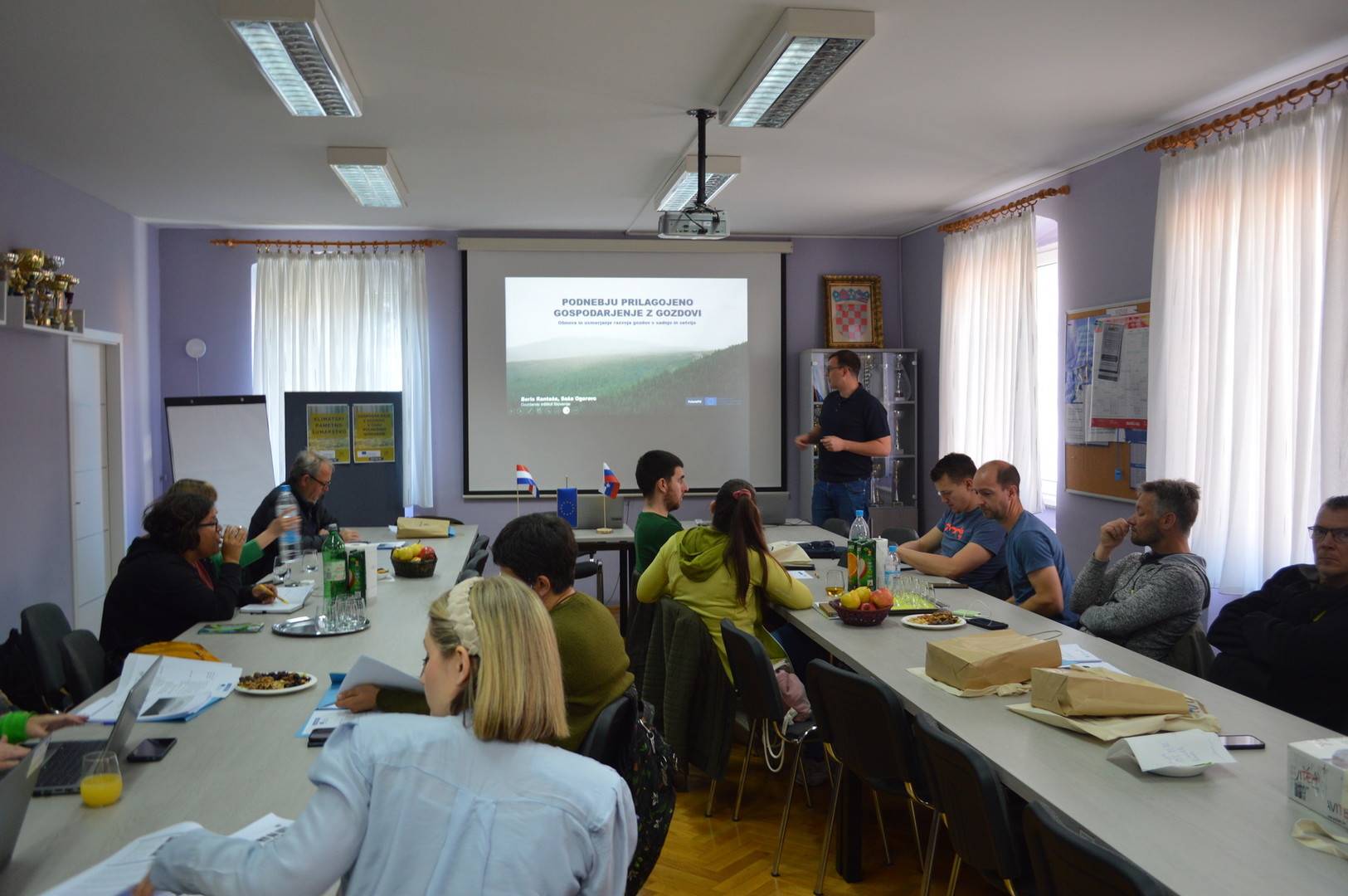 Prvi dan se je pričel v prostorih Srednje šole Otočac, kjer sta udeležence pozdravila ravnatelj prof. Ivan Vidmar ter predstavniki Gozdarskega inštituta Slovenije in združenja Udruga Forestis. Predavanja so bila osredotočena na ključne izzive: od razumevanja podnebnih sprememb do konkretnih rešitev v okviru podnebno pametnega gozdarstva. Andrej Breznikar (GIS) je izpostavil nujnost prilagajanja načrtov gospodarjenja z gozdovi novim razmeram. Dan smo zaključili s terenskim ogledom mikrovrta v okviru projekta MyGardenOfTrees.