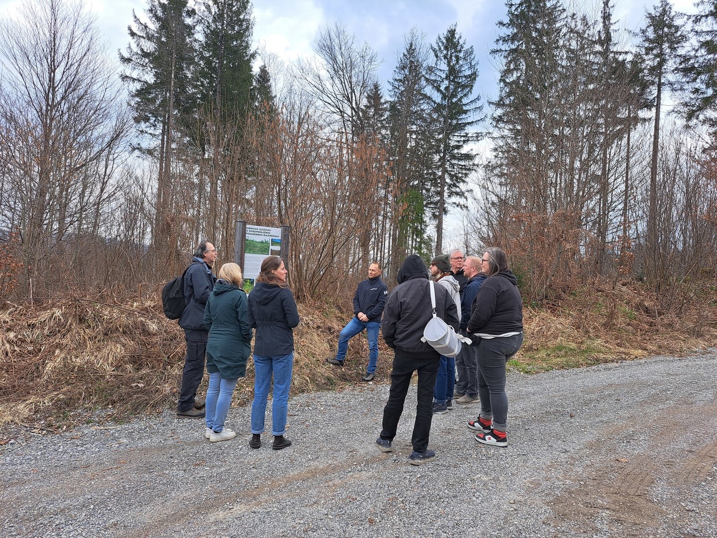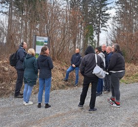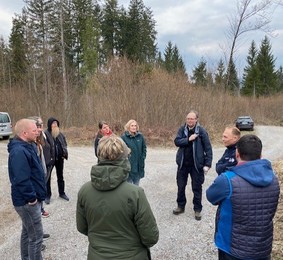 Drugi, terenski, del srečanja je potekal v Dolnjih Ložinah pri Kočevju, kjer sta dr. Boštjan Mali in dr. Gregor Božič na raziskovalni ploskvi projekta LIFE IP CARE4CLIMATE predstavila kombinacijo naravne in umetne obnove gozdov. Udeleženci so si ogledali s sadnjo pomlajeno površino ter razpravljali o sadilnem načrtu in različnih pristopih obnove po velikopovršinskih motnjah, ki so zaradi podnebnih sprememb vse pogostejše. Hkrati smo izpostavili vse večjo vlogo gozdov v krožnem biogospodarstvu in s tem povezana pričakovanja družbe.